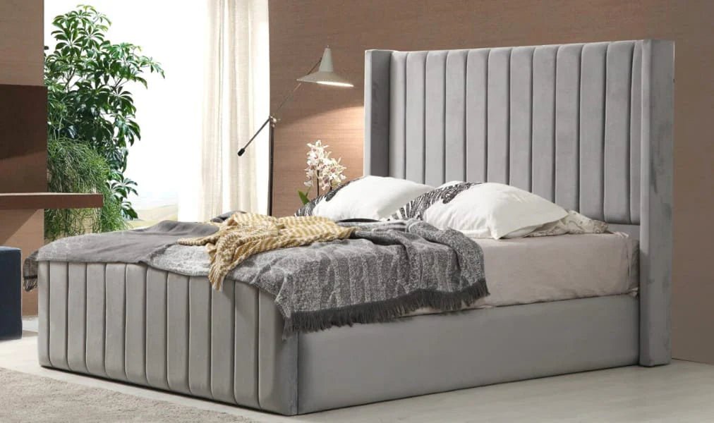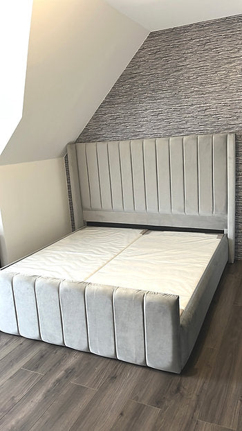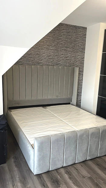 Structure & Matière : Cadre et Tête de lit en panneau agglomérer, capitonnage Mousse HR, Tissu Velours.