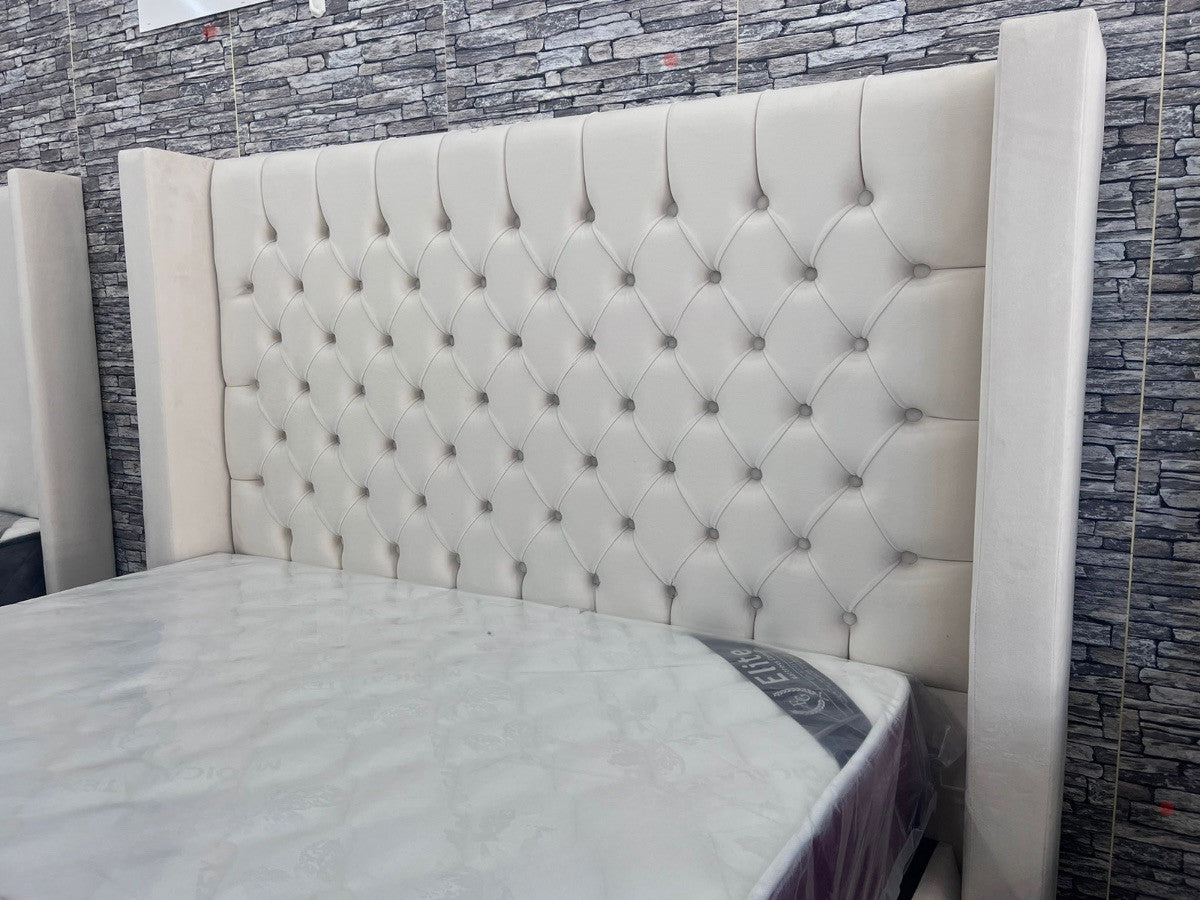 Donnez à votre chambre à coucher un grain de modernisme avec votre lit double coffre capitonné en velours . Décliné en beige, votre lit se marie parfaitement à tout type d'intérieur, vintage, classique ou plus actuel. Pensé avec une inspiration de décoration tendance, votre lit double coffre capitonné arbore une finition royale et élégante accentuée par une tête de lit cloutée, des pieds en métal chromé et un tissu haut de gamme en velours beige. Profitez d'un double coffre suffisamment grand pour y ranger facilement couettes, draps, coussins et plaids.