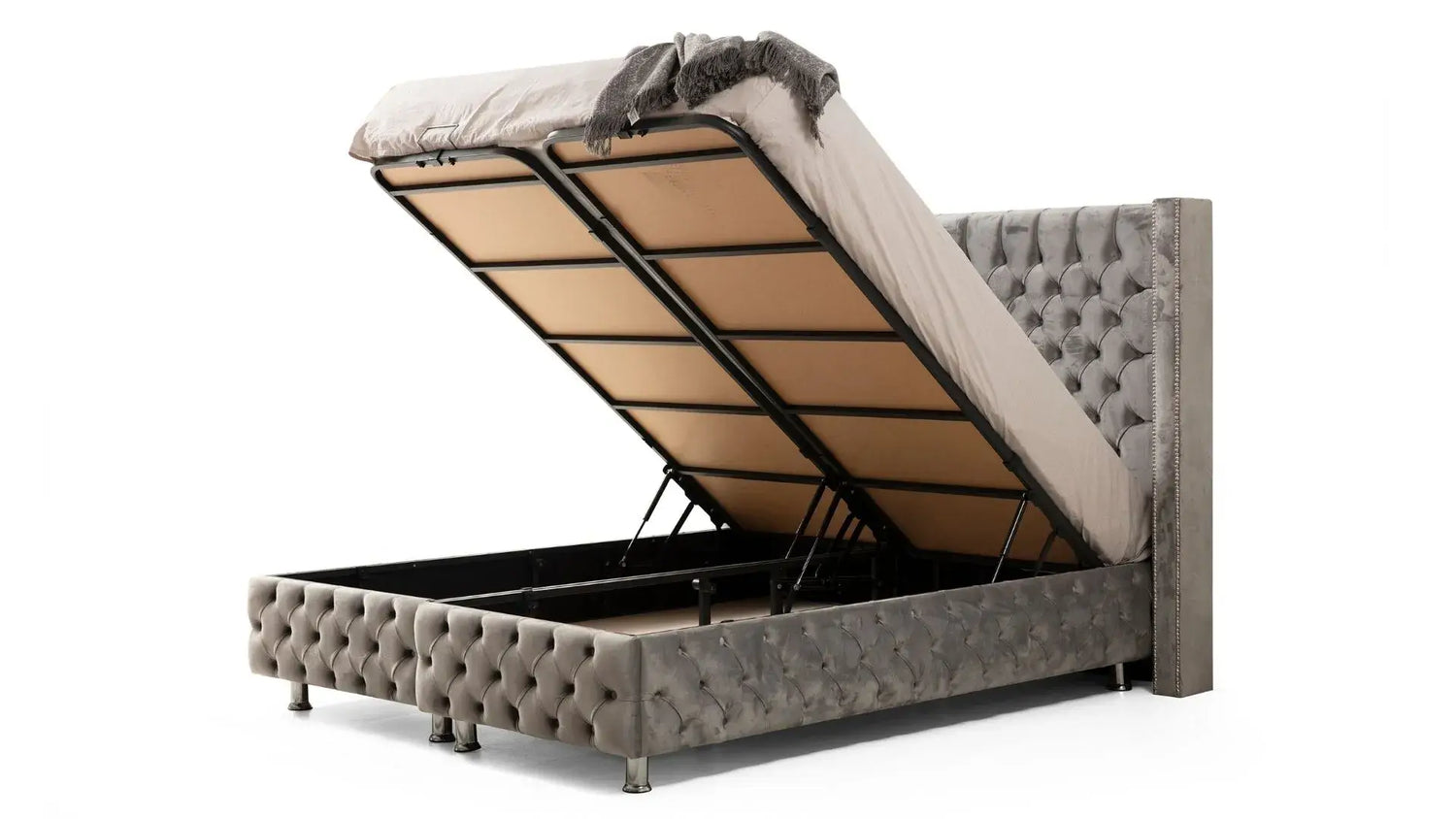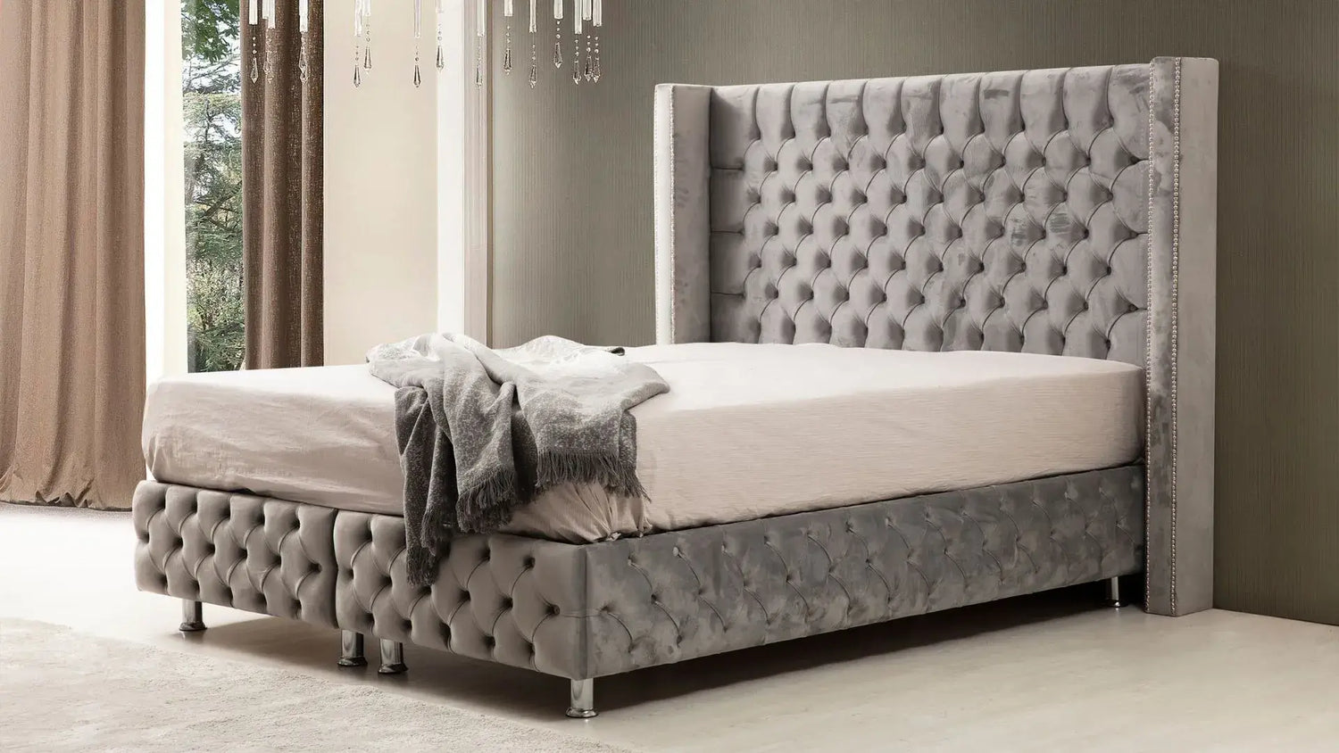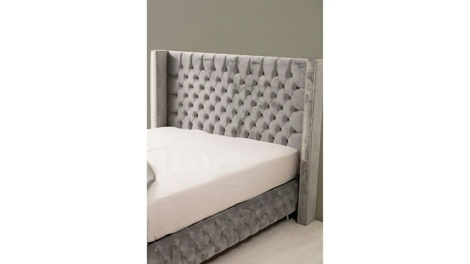 Lit Coffre CLOUTE GRIS - Velours capitonné
