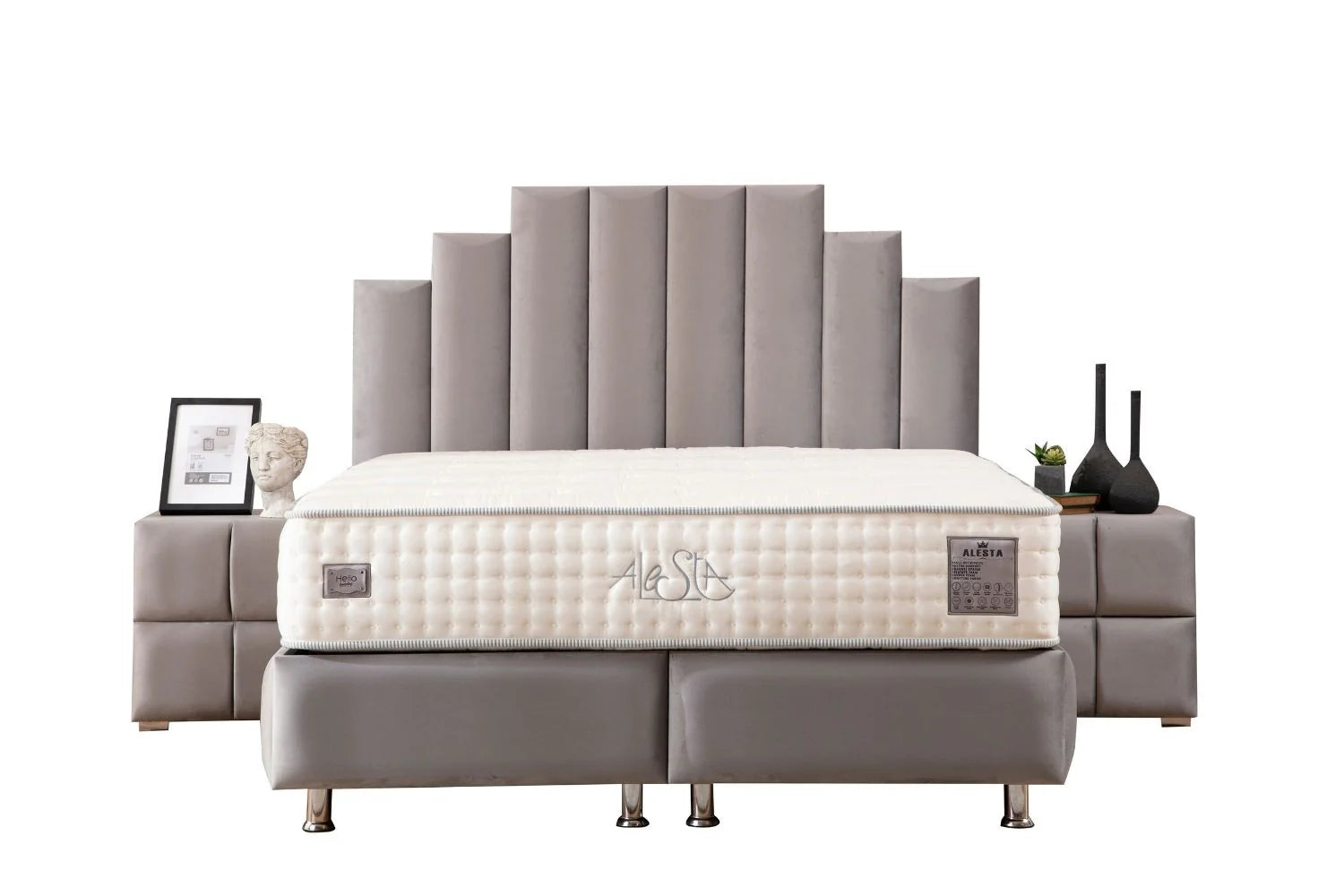 Les amoureux de la nature, découvrez le lit double coffre Natura en velours . Avec sa tête de lit élégante, ses pieds de lit en chrome et un tissu en velours de haute qualité, le lit double coffre Natura arbore une finition tout aussi raffinée que simpliste. Décliné en coloris gris, votre lit 2 places s'intègre parfaitement dans tout type d'intérieur : vintage, moderne, traditionnel. Doté d'un double coffre large, votre lit dispose de tout l'espace nécessaire pour ranger vos draps, plaids, coussins et couettes.
